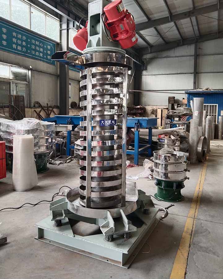 DZC系列垂直振动提升机的驱动装置振动电机安装在输送塔下部,两台振动电机对称交叉安装,输送塔由管体和焊接在管体周围的螺旋输送槽组成,输送塔座于减振装置上,减振装置由底座和隔振弹簧组成。当垂直输送机工作时,根据双振动电机自同步原理,由振动电机产生激振力,强迫整个输送塔体作水平圆运动和向上垂直运动的空间复合振动,螺旋槽内的物料则受输送槽的作用,作匀速抛掷圆运动,沿输送槽体向上运动,从而完成物料的向上(或向下)输送作业。
