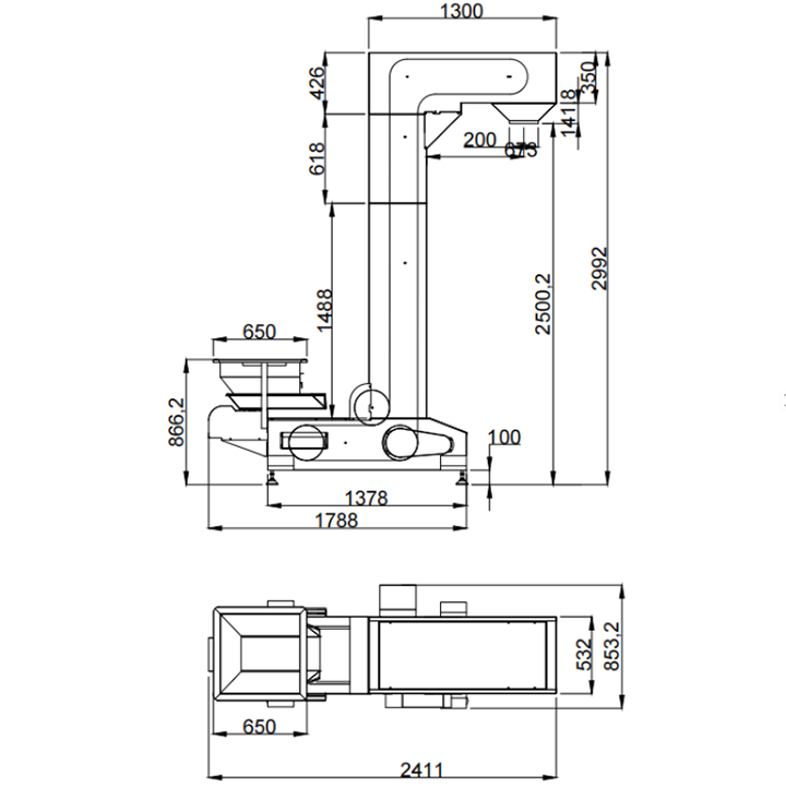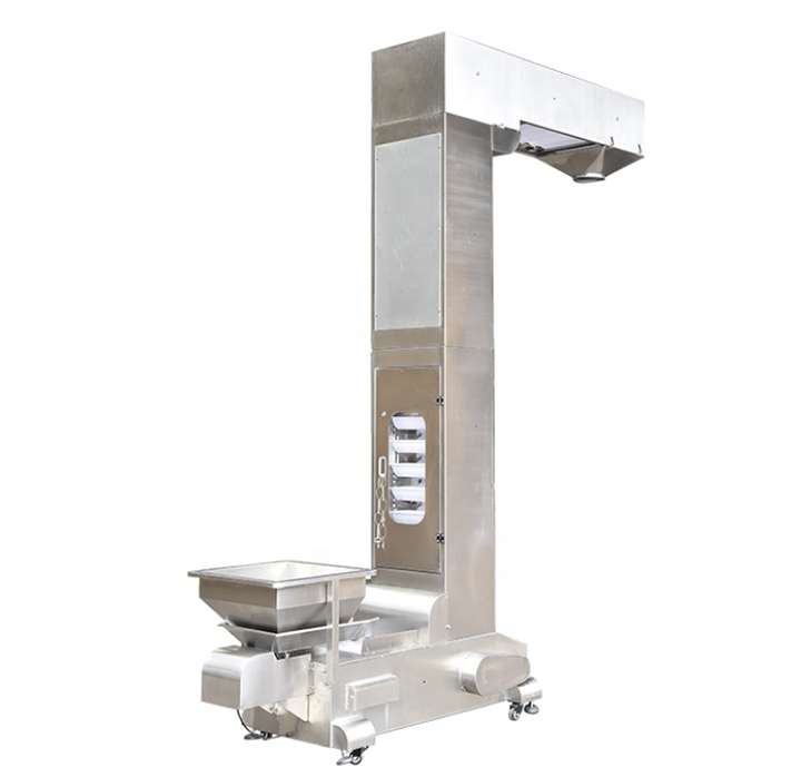 链条式Z型输送机通常配备板链或附件链条,较高的承载能力和抗冲击性能。输送高度范围可达2-15米以上,常用链条宽度为300–600mm,载重能力可达2t/h以上,适用于生产线负荷大、袋体较重或大容量液体袋的液体包装场景。