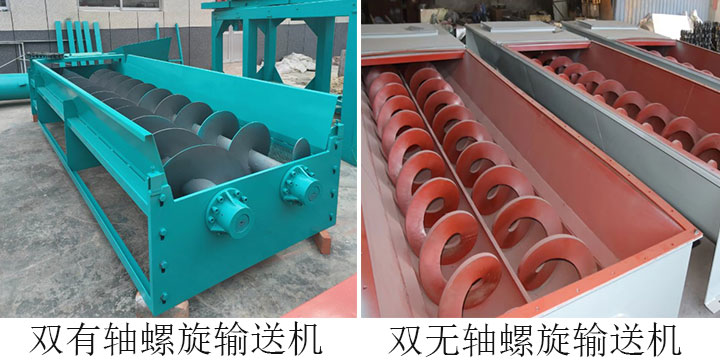 双螺旋输送机根据机器结构内部的区别可以分为双无轴旋输送机和双有轴旋输送机,双无轴相比于双有轴更适合输送缠绕性强的物料,比如厨余垃圾、脱水污泥、纸浆等易缠绕、高粘稠物料等。双有轴适合输送水泥、矿粉、谷物等干燥松散的粉状与颗粒物料,输送量比双无轴的输送量大,通常在 10-100m³/h 左右。在选择这两种类型的时候要根据物料的形态的输送的具体需求进行选择。