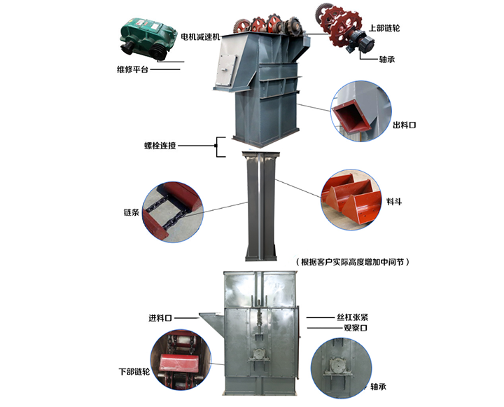 产品简介:小型斗式提升机是用来垂直运送粉料、颗粒料和小块料的连续输送设备,能把物料从低处送到高处,让供料流程自动运转,不用人工来回搬运。